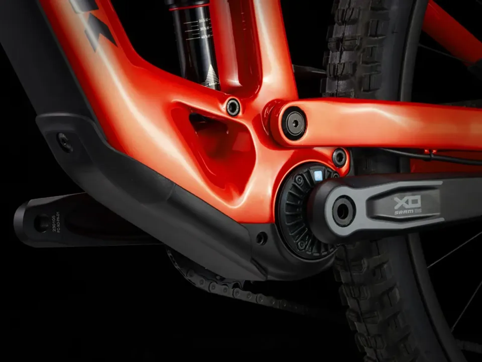 OCLV Mountain Carbon, removable battery, internal routing, alloy rocker link, 34.9 mm seat tube, upper chain guide mount, 55 mm chainline, Mino Link, ABP, Boost148, UDH, 140 mm travel