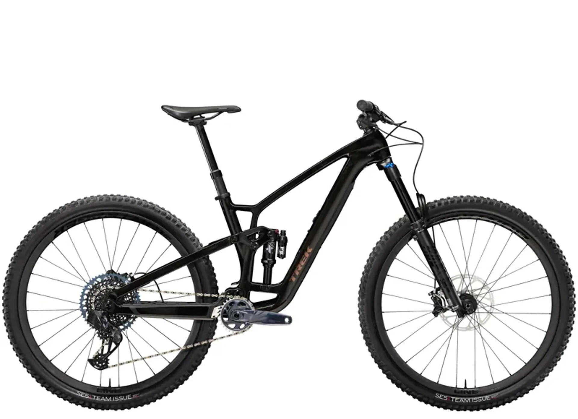 It's loaded with the latest tech like a wireless SRAM GX AXS drivetrain that's super clean-looking and customisable. 150 mm front and 140 mm rear suspension keep you in control on the roughest trails and it's all topped off with carbon Bontrager wheels with a quick-engaging hub.